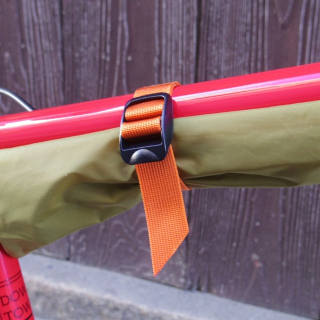 写真の使用例ではトップチューブにタープポールを固定しています。