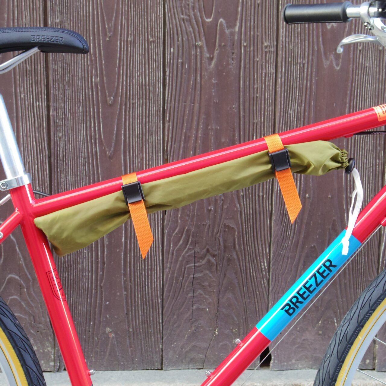 写真の使用例では自転車のトップチューブにタープポールを固定しています。